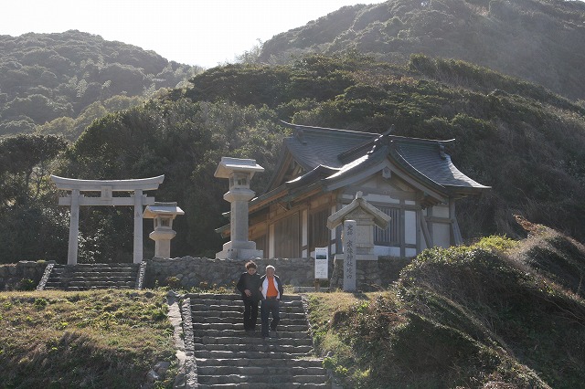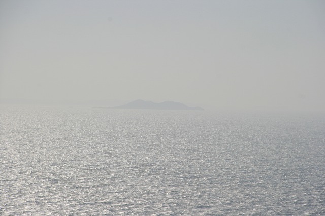 遙拝所を参拝させていただき、左の丘に登ると、ありがたいことに、この島から沖合50㎞も先にある沖ノ島を拝むことができました。その幽玄なお姿に、「わー、すごい!」と、思わず歓声が上がります。(最初、海上の船を沖ノ島と間違えて皆で参拝してしまうというハプニングもありましたが、無事、島自体を遙拝することができました)