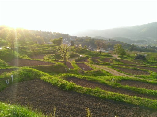 姥捨山長楽寺の近くには、日本の原風景である田んぼの棚田の風景が広がっています。この地域の棚田は日本三大車窓に数えられている絶景です。
