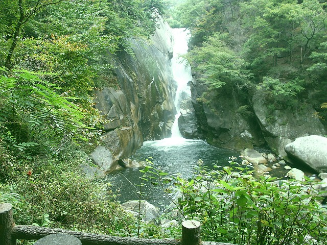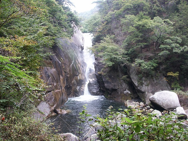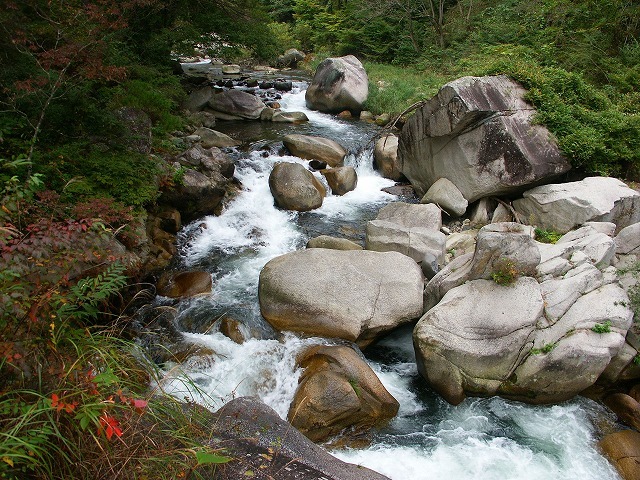 長潭橋(ながとろばし)から仙娥滝までの約5㎞の渓谷で、川の流れにより、深く侵食された花崗岩による奇岩が至る所に見られます。平成の名水百選にも選ばれています。